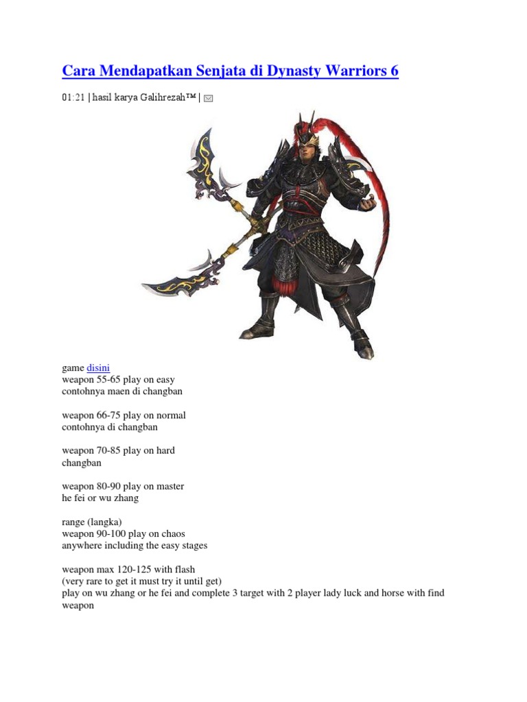 Kalahkan dia di kubu wu, di he fei d a l a m 5 m e n i t. Sebenarnya untuk mendapatkan kuda dalam dynasty warrior 6 tidak lah sulit. His eye see the world in prosperity, and he have heavenly physique. Oleh karena itu, selalu kunjungi gamedaim ya. Cara mendapatkan karakter dynasty warrior 6.